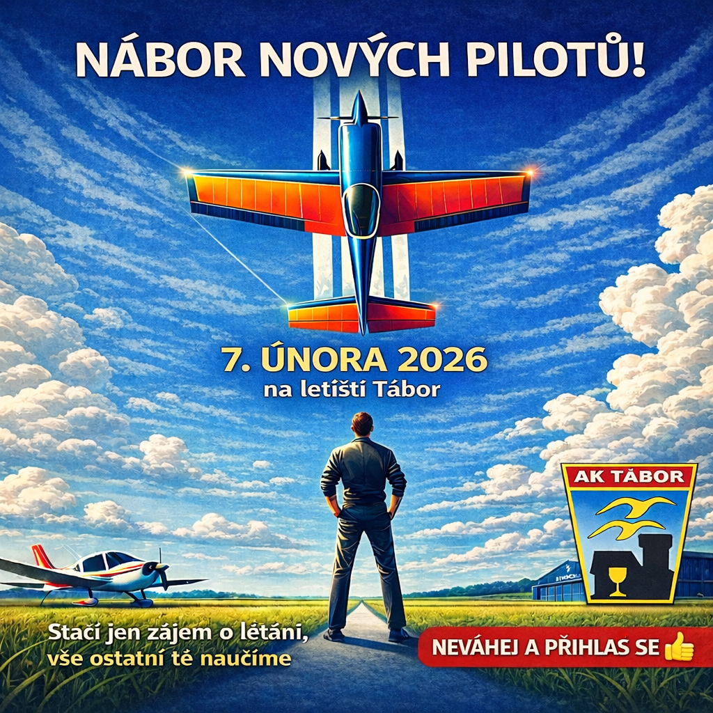 ✈️ Sníš o létání? Přijď udělat první krok! ✈️ Ať už tě láká tiché plachtění ve větroních, nebo chceš udělat první krok v kariéře dopravního pilota, přijď se podívat k nám do Aeroklubu Tábor. 📅 Sobota 7. 2. 2026 🕙 od 10:00 Na schůzce se dozvíš, jaké výcviky u nás můžeš absolvovat, jak funguje aeroklub, a na závěr ti ukážeme naše letadla, ať víš, co tě čeká ✈️. Nejde ale jen o létání – získáš skvělou partu lidí, nové zázemí a místo, kam se budeš rád vracet 😊. Možná právě tady začíná tvoje pilotní cesta
